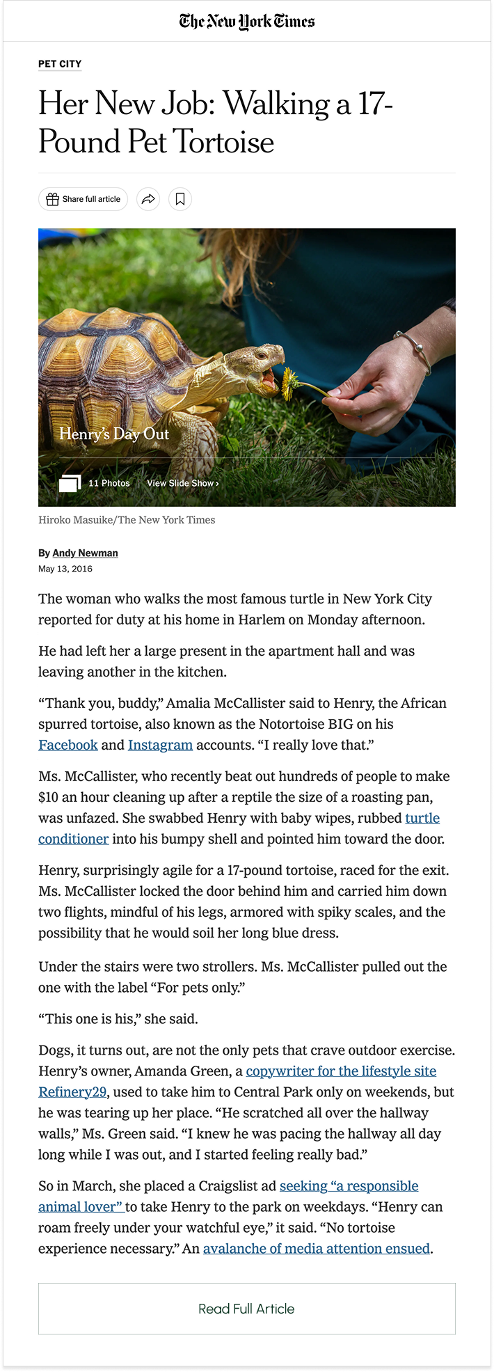 When spring came early in March 2016, I posted a Craigslist ad looking for a tortoise walker to take Henry to Central Park on weekdays. The post went viral. Henry and I were mentioned on Good Morning America, interviewed on BBC Radio and local news, and covered by hundreds of media outlets around the world. CBS Evening News followed the tortoise walker interview process, and The New York Times joined Henry and his new walker on one of their first outings.
